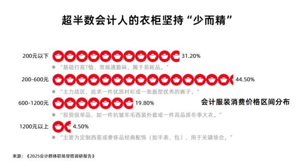 精打細算的職業(yè)本能,深刻影響了他們的消費觀。企業(yè)會計的衣櫥堪稱“高效資產(chǎn)配置”。58.7%的人奉行“少而精”原則,愿意為核心單品支付更高單價,追求更優(yōu)的材質(zhì)和更長的穿著周期。