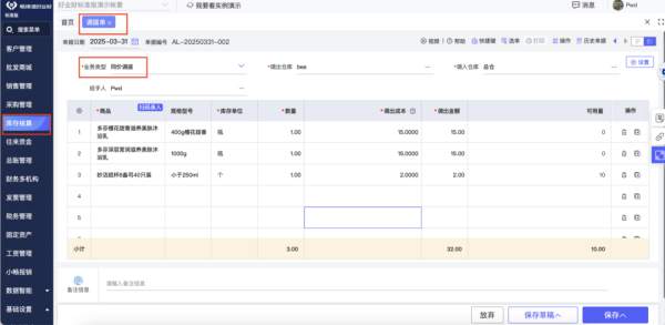 多倉管理與調(diào)撥: 在系統(tǒng)中建立與實際對應(yīng)的多個門店倉和總倉檔案。通過【調(diào)撥單】清晰記錄貨品在各倉庫間的流轉(zhuǎn),確保賬實相符。