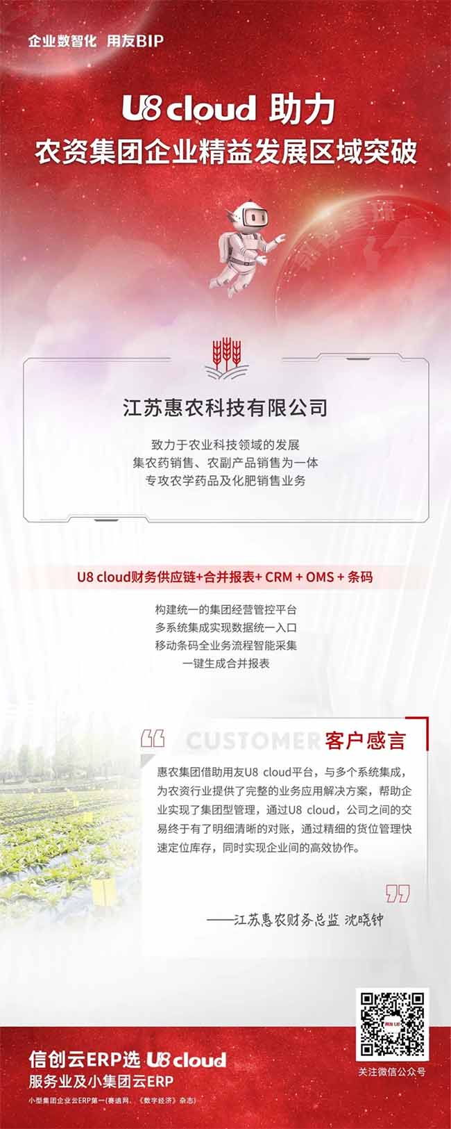 “惠農(nóng)ERP數(shù)智信息化”項(xiàng)目從規(guī)劃到建設(shè),用友U8 cloud僅用了半年時(shí)間實(shí)現(xiàn)了ERP和 CRM雙系統(tǒng)上線,ERP與OMS系統(tǒng)和條碼系統(tǒng)的集成管理, 對處于企業(yè)信息化管理階段的江蘇惠農(nóng)和類似農(nóng)資行業(yè)客戶探索數(shù)智化,更具有非凡的里程碑意義和參考價(jià)值。