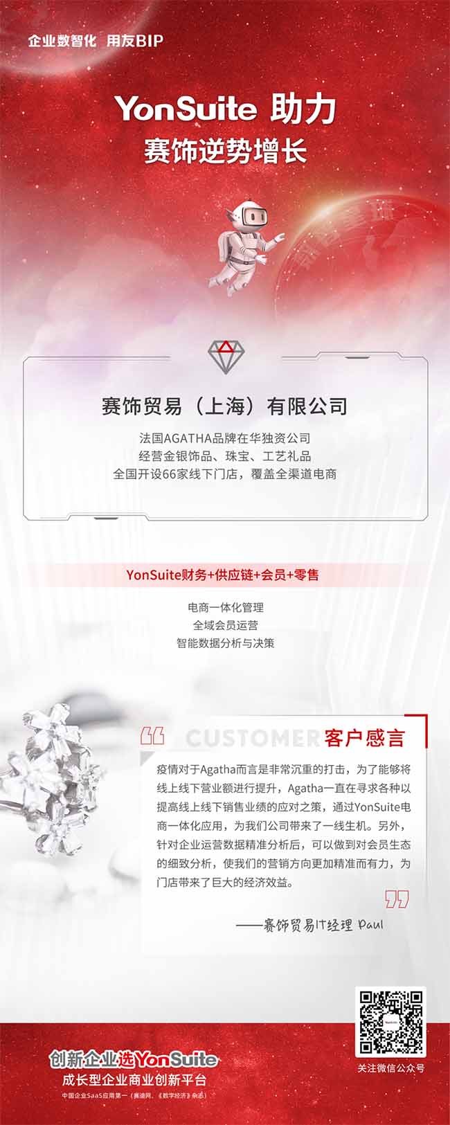 賽飾貿(mào)易(上海)有限公司是由法國(guó) AGATHA 品牌在中國(guó)成立的獨(dú)資公司,經(jīng)營(yíng)范圍包括金銀飾品、珠寶(毛鉆、裸鉆除外)、工藝禮品(文物除外)等,全國(guó)共開(kāi)設(shè)了 66 家線(xiàn)下門(mén)店,并且各大電商平臺(tái)都有相應(yīng)旗艦店鋪。從成立至今在國(guó)內(nèi)累積了大批忠誠(chéng)用戶(hù),會(huì)員量超過(guò)三十多萬(wàn)。
