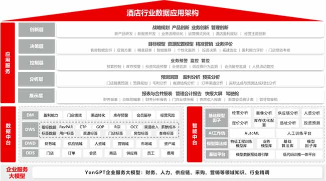 以YonGPT企業(yè)大模型為支撐,通過(guò)用友iuap數(shù)據(jù)中臺(tái)對(duì)酒店企業(yè)的人、財(cái)、經(jīng)營(yíng)、營(yíng)銷(xiāo)、資產(chǎn)、供應(yīng)鏈等多元業(yè)務(wù)數(shù)據(jù)進(jìn)行匯聚和治理,并圍繞核心業(yè)務(wù)線(xiàn)的經(jīng)營(yíng)、管理、會(huì)員、運(yùn)營(yíng)等重要指標(biāo)構(gòu)建分析體系,利用智能中臺(tái)的模型算法庫(kù)訓(xùn)練、構(gòu)建的酒店行業(yè)模型因子,為酒店企業(yè)提供5層全面數(shù)據(jù)服務(wù),深入洞察企業(yè)運(yùn)營(yíng)、識(shí)別潛在的業(yè)務(wù)風(fēng)險(xiǎn)和機(jī)會(huì),并提供智能化的解決方案,從而提高經(jīng)營(yíng)決策水平和業(yè)務(wù)運(yùn)營(yíng)效率。