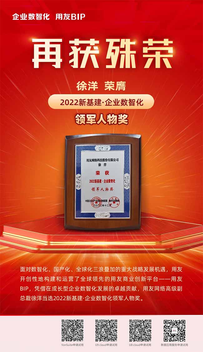 今年1月,國務(wù)院印發(fā)的《“十四五”數(shù)字經(jīng)濟(jì)發(fā)展規(guī)劃》明確提出,到2025年,數(shù)字經(jīng)濟(jì)核心產(chǎn)業(yè)增加值占國內(nèi)生產(chǎn)總值比重達(dá)到10%;展望2035年,力爭形成統(tǒng)一公平、競(jìng)爭有序、成熟完備的數(shù)字經(jīng)濟(jì)現(xiàn)代市場(chǎng)體系,數(shù)字經(jīng)濟(jì)發(fā)展水平位居世界前列。依托國家政策紅利,面對(duì)數(shù)智化、國產(chǎn)化、全球化三浪疊加的重大戰(zhàn)略發(fā)展機(jī)遇,用友開創(chuàng)性地構(gòu)建和運(yùn)營了全球領(lǐng)先的用友商業(yè)創(chuàng)新平臺(tái)——用友BIP,憑借在成長型企業(yè)數(shù)智化發(fā)展的卓越貢獻(xiàn),用友網(wǎng)絡(luò)高級(jí)副總裁徐洋當(dāng)選2022新基建·企業(yè)數(shù)智化領(lǐng)軍人物獎(jiǎng)。