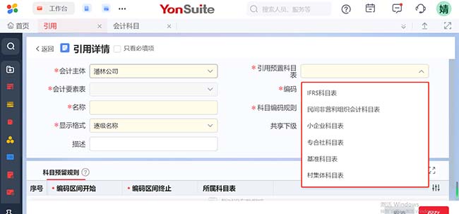 路徑:財務云 > 事項會計中臺 > 財務公共 > 科目中心-科目表,選擇對應的會計主體,點擊引用: